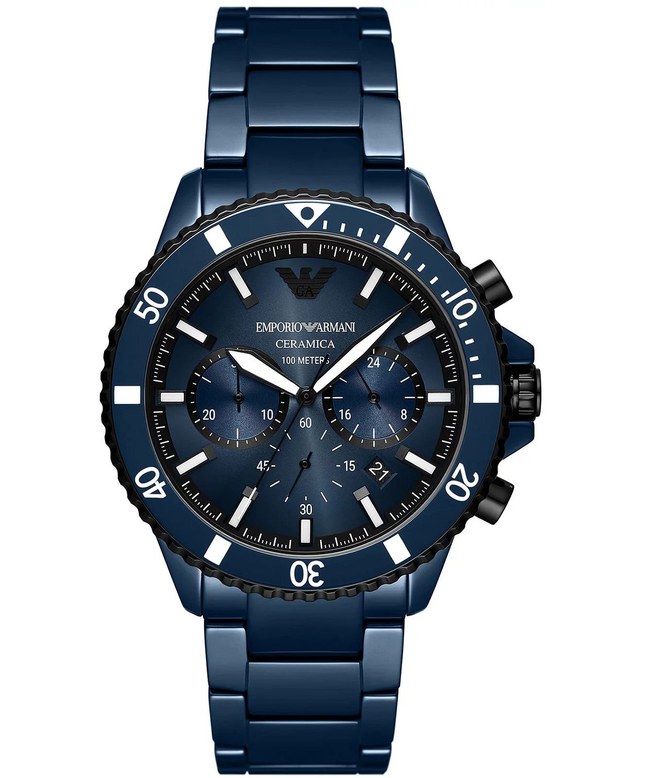 Emporio Armani’s 44mm watch features a grey sunray dial with black and blue stick indexes, chronograph movement and stainless steel…